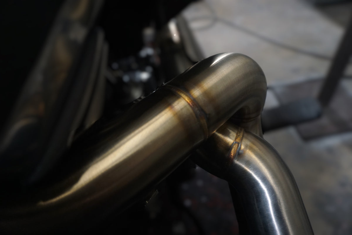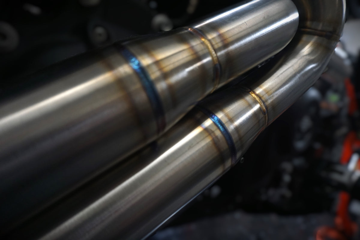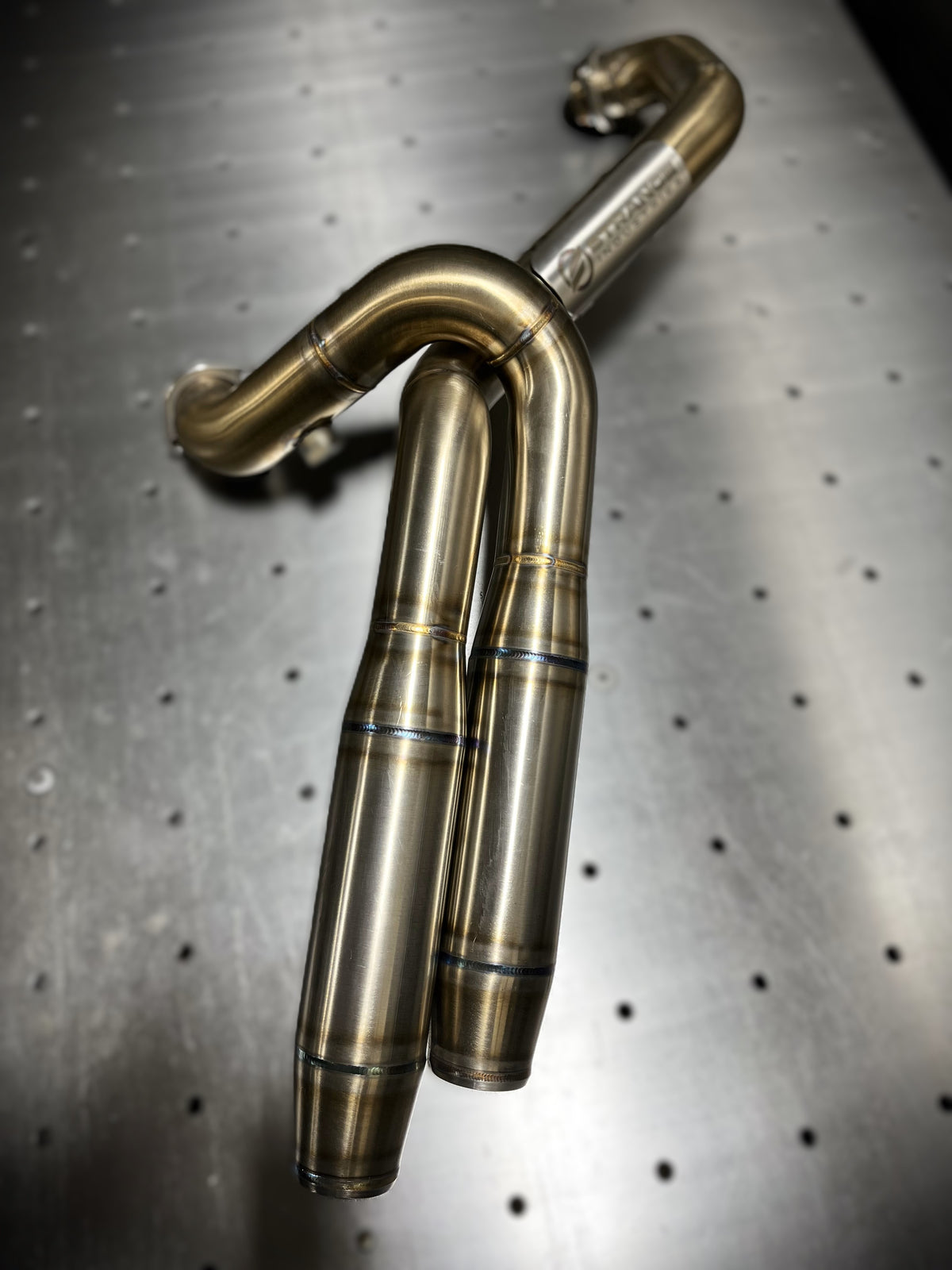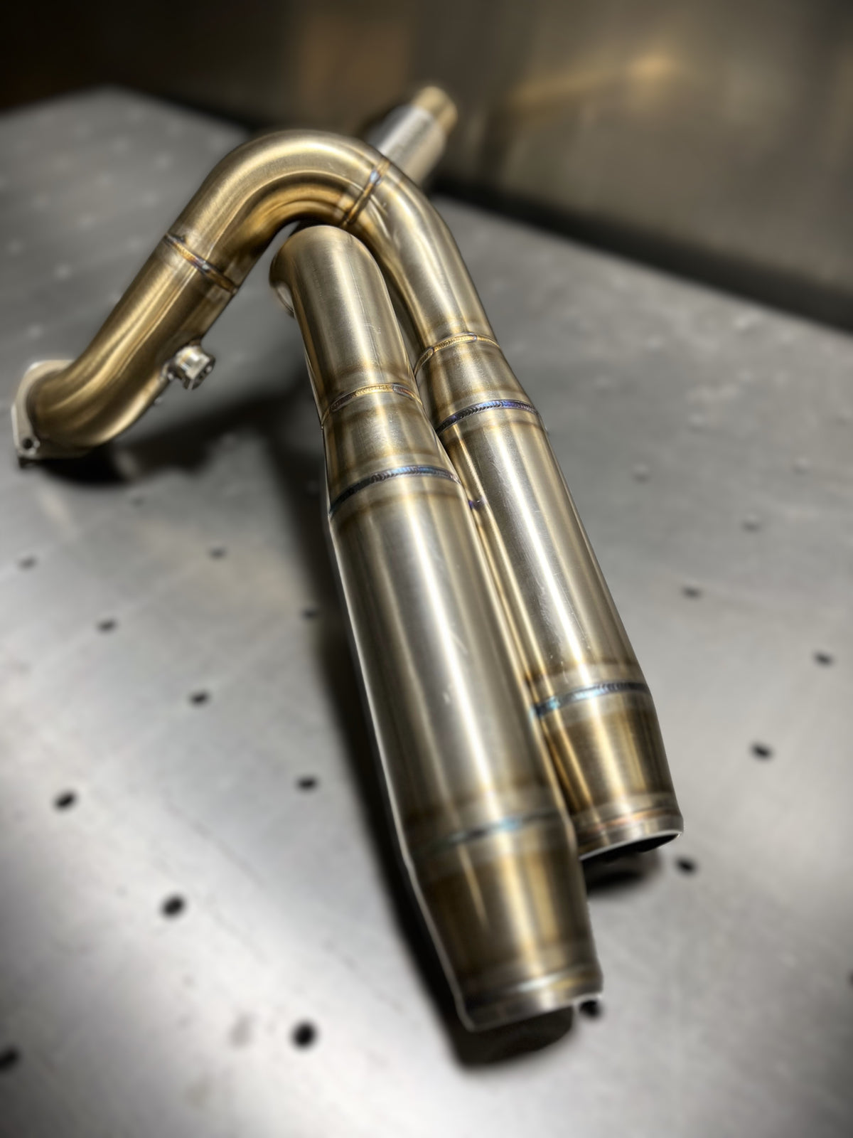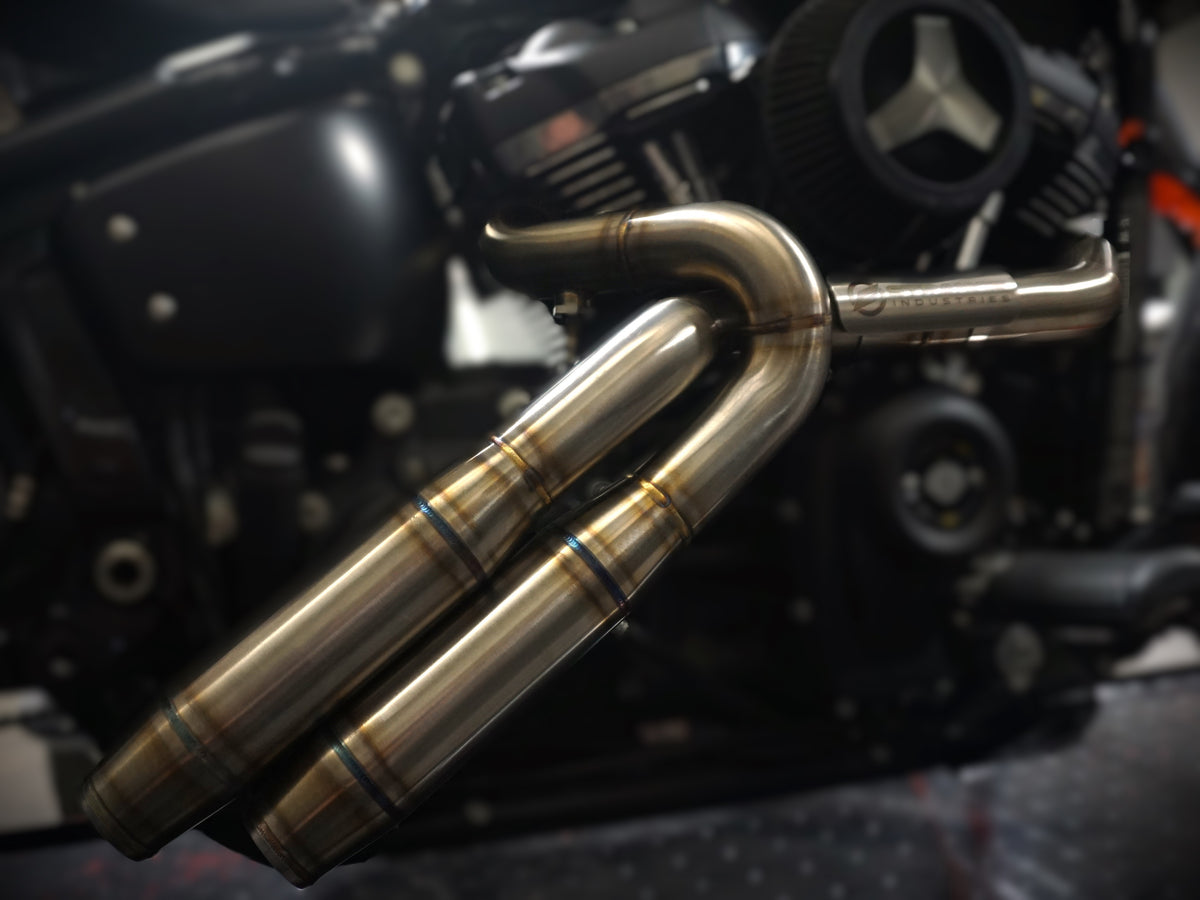 The Stag 45 Harley Davidson M8 exhaust system is built to go fast and scare your neighbors. It is fully built from 304 stainless steel, down to the packing inside the mufflers. It features billet input flanges, machined retaining flanges, machined O2 bungs in the standard m18 as well as machined adapters for the m12 O2 sensors that come on the bike from the factory. This allows for ease of tuning and ability to run either sizes when demanded. The mandrel bent runners are 1 7/8" to 2" and terminate in dual 2.5" mini mufflers to tame the beast, just a little. The muffler has billet inlets and a billet outlet caps for a high quality finish. Everything is TIG welded and back purged so you can rest assured that this system is built to last, and will look good doing it.